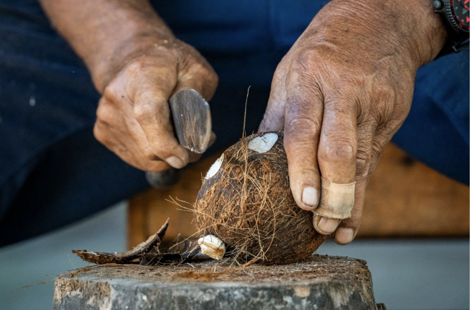 (Image: Wak Udin demonstrating his skill preparing coconuts)